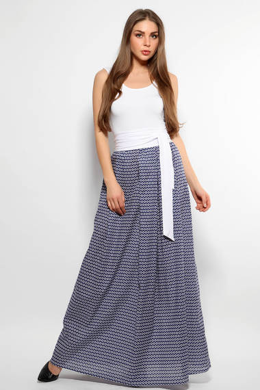 Длинное платье выполнено из двух видов ткани: хлопковая юбка синего цвета и верх  виде белой майки из хлопкового трикотажа. В комплекте длинный пояс.