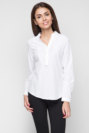ОписаниеНежная блузка с длинными рукавами. Модель из 100% хлопка, с аккуратным воротом "стойкой" и кружевными вставками на плечах.
